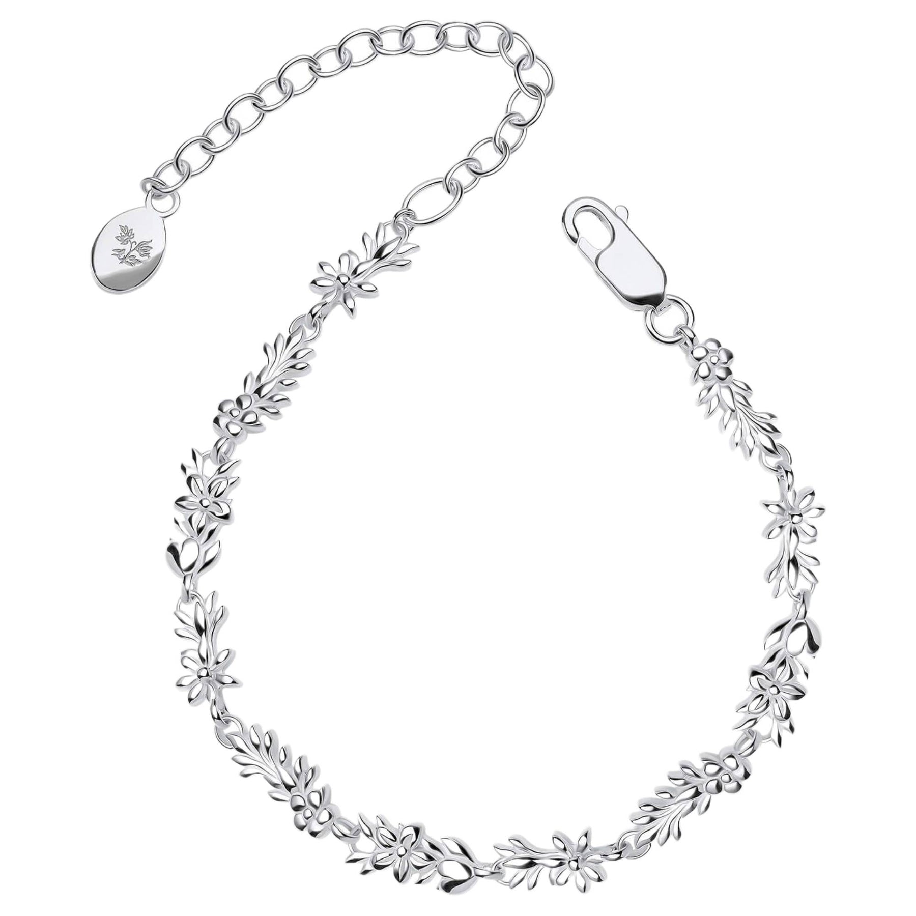Expertly fashioned from recycled sterling silver, this refined bracelet draws inspiration from Laura Ashley’s Naunton Folly print. This unique painted design, rooted in Laura Ashley’s rich archive, blends motifs from multiple patterns to depict a charming British stately home garden. The bracelet features a continuous chain of delicate blossoms, echoing the romantic garden paths and the balanced arches adorned with roses that characterize the original print. Ideal for adding a subtle feminine elegance, it pairs beautifully with matching pieces to evoke the classic grace and allure of a serene English summer.