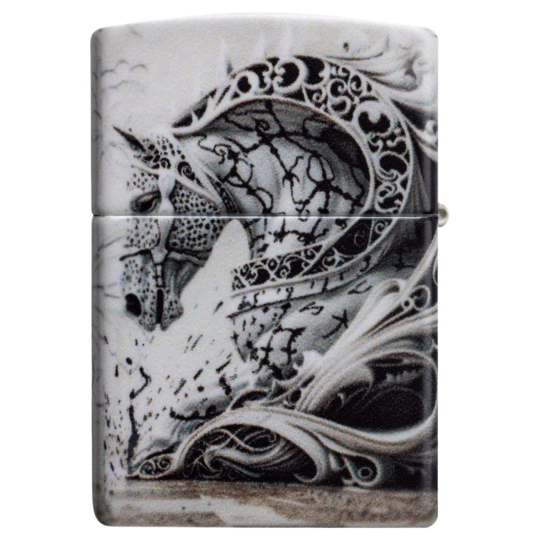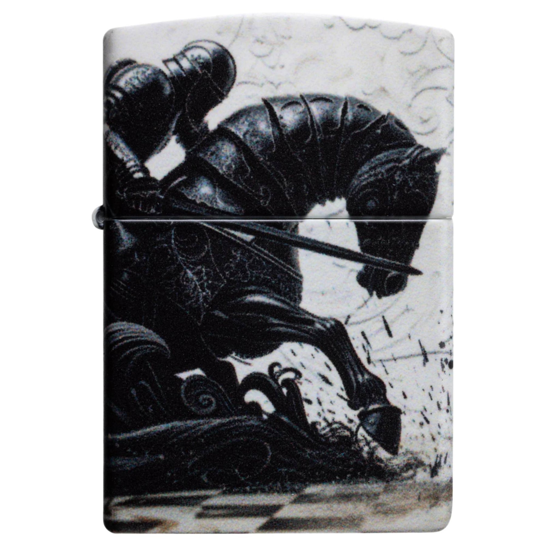 Bring strategic elegance to your collection with this distinctive 540° Colour lighter showcasing an intricate Knights motif. The wraparound design captures two formidable chess pieces locked in combat, rendered with meticulous detail across the entire surface. A timeless accessory that merges the intellectual appeal of chess with Zippo's renowned craftsmanship and reliability.