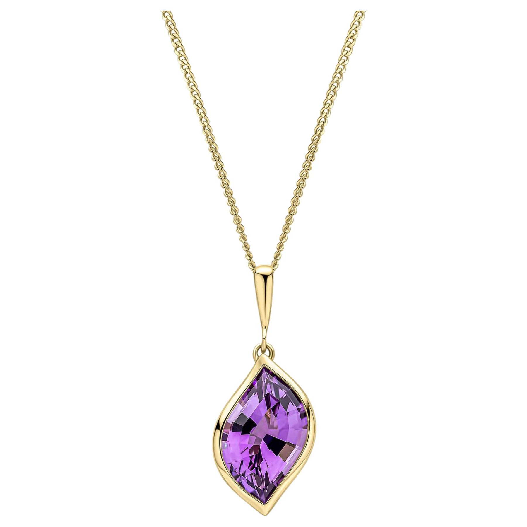 This 9ct yellow gold pendant offers a contemporary interpretation of antique elegance, showcasing a distinctive flame cut amethyst inspired by 17th-century ornamental designs. Its sculptural form and rich violet color deliver a refined yet striking look, merging historical influence with modern style. Complement it with the coordinating earrings for an impressive ensemble that celebrates heritage while shining with current sophistication.