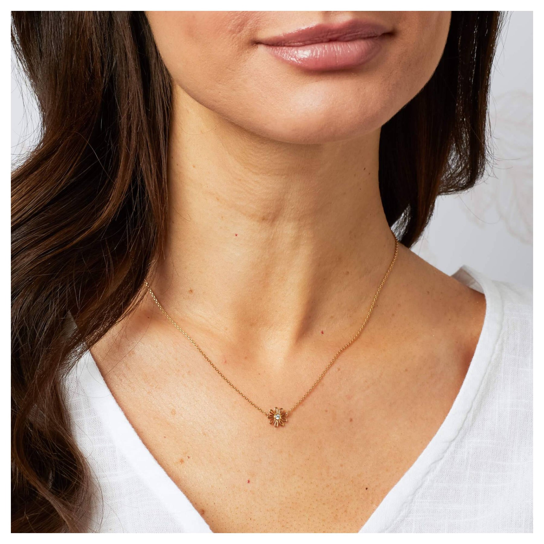 Drawing inspiration from Laura Ashley’s Thorncliff Daisy print, this elegant necklace captures the print’s stylised daisy motif with finesse. Made from gold-plated recycled sterling silver, it showcases a delicate daisy adorned with sparkling cubic zirconia. The refined design echoes the classic floral elements of the original pattern, offering a sophisticated and romantic touch. Perfectly complemented by matching earrings, this piece adds enduring floral elegance to any ensemble.