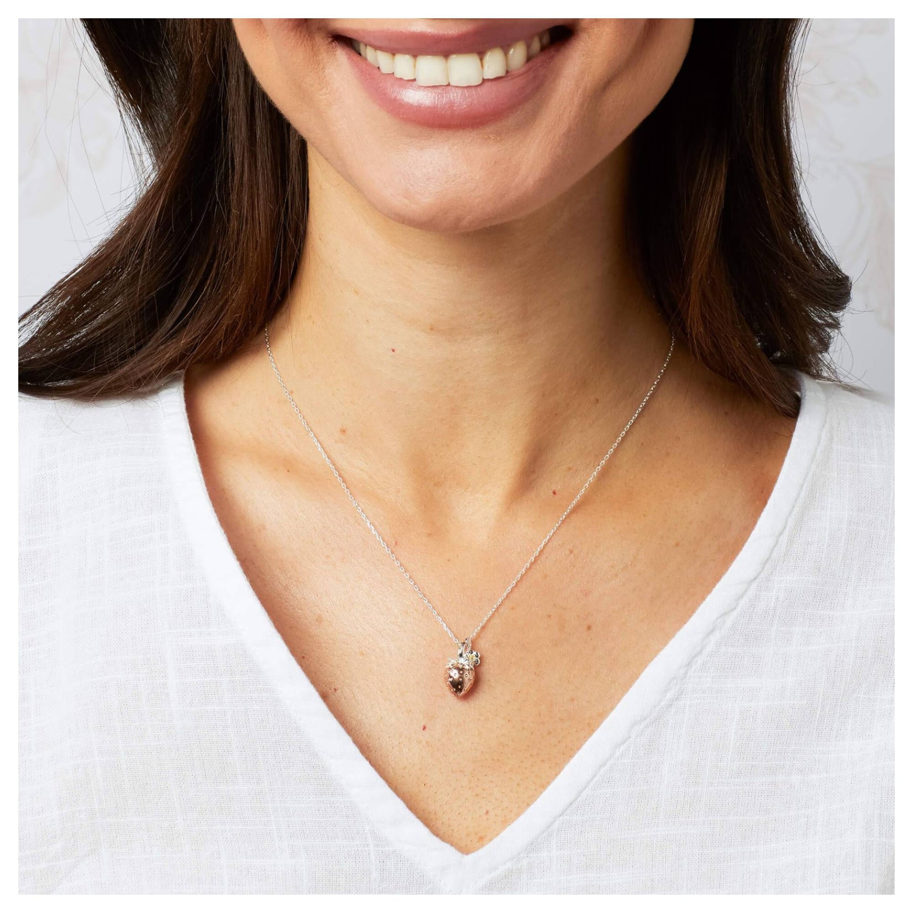 Drawing inspiration from the enchanting details of Laura Ashley’s iconic Strawberry Field print, this elegant necklace embodies a whimsical charm and timeless femininity. Made from recycled sterling silver, it showcases a polished rose gold-plated strawberry alongside a silver flower accented with a delicate yellow gold-plated centre, reflecting the berries and blossoms of the original pattern. Perfectly capturing the spirit of nature and sunny outdoor moments, this piece offers a romantic touch to any jewellery collection and pairs beautifully with the coordinating earrings.